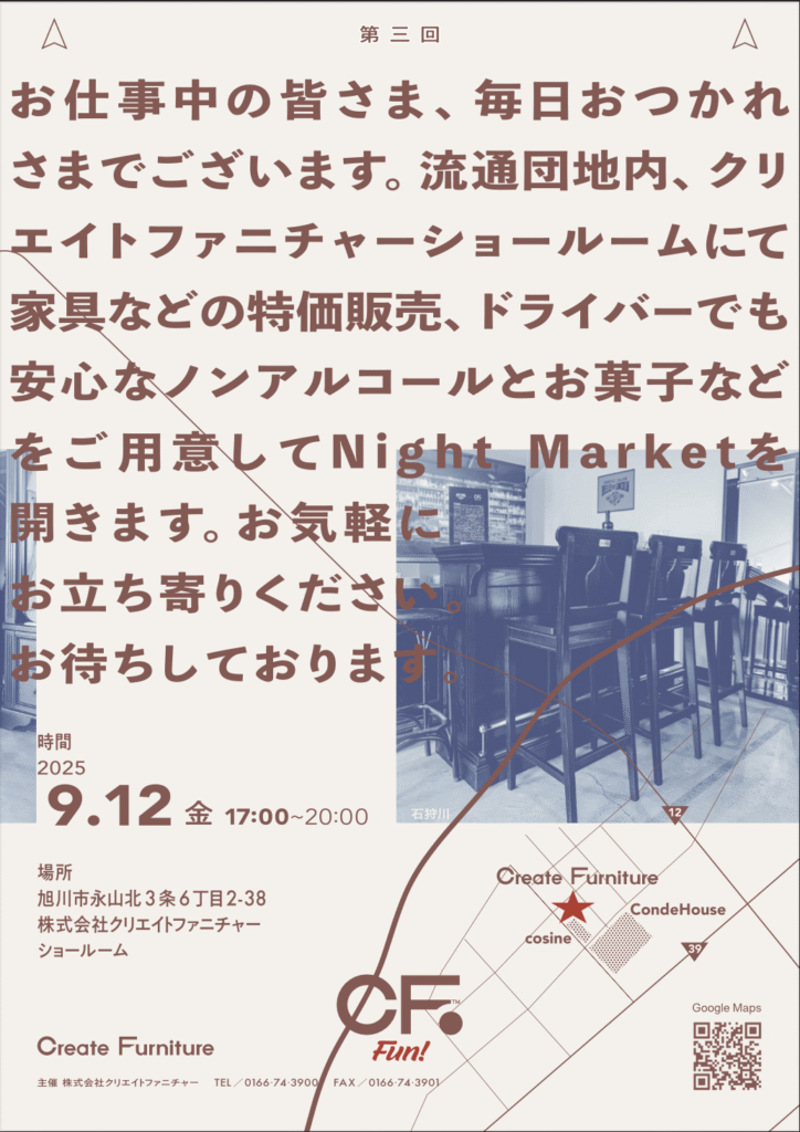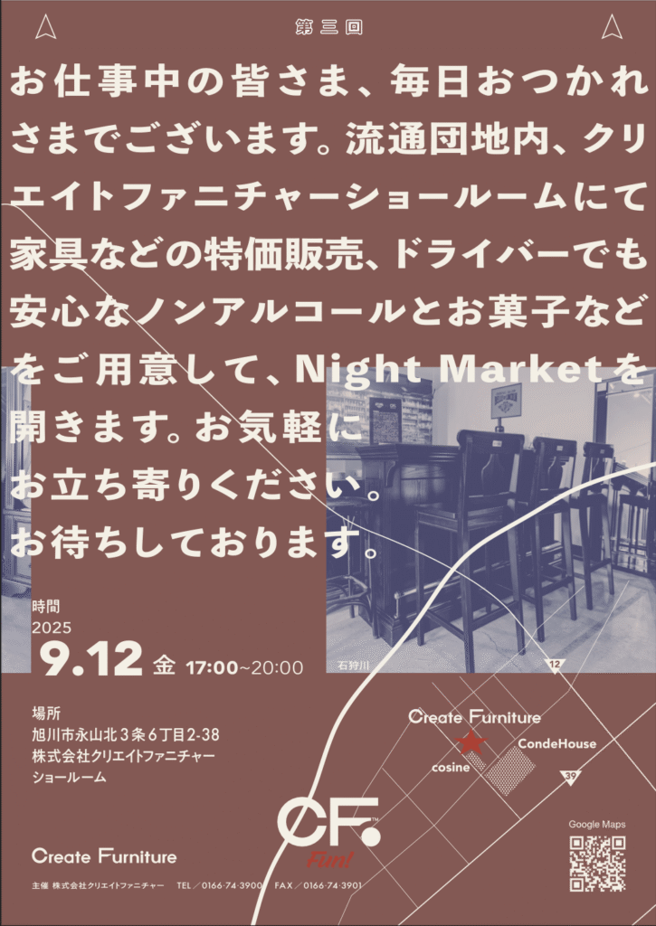 この度、クリエイトファニチャーのショールームにて、第三回目となる「Night Market」を開催することになりました。