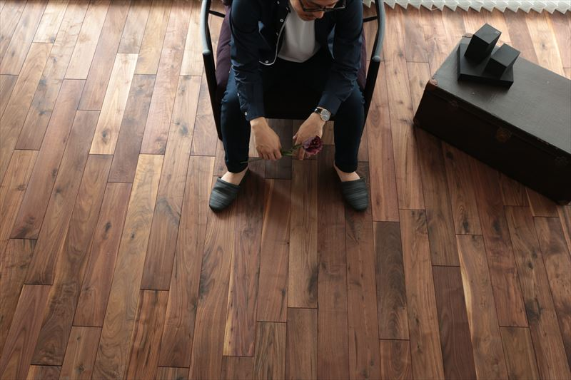 ウォールナット無垢材は床材としても人気を誇ります。耐久性と高級感を兼ね備え、素足で歩いたときの心地よさは合板フローリングでは得られない魅力です。