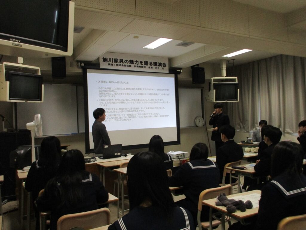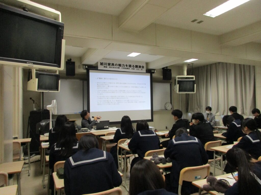 この講演会は、「旭川家具の魅力を語る」をテーマに、未来を担う地元の高校生たちに、旭川の基幹産業である家具づくりについて深く知っていただくための出前講座です。